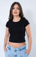 Confeccionada en 100% algodón suave, con silueta ajustada y corte crop. Incorpora cuello redondo en rib (conserva la forma lavado tras lavado) y detalle smiley tono a tono al frente para sumar buenas vibras a cualquier look. Perfecta para combinar con denim, faldas o joggers.