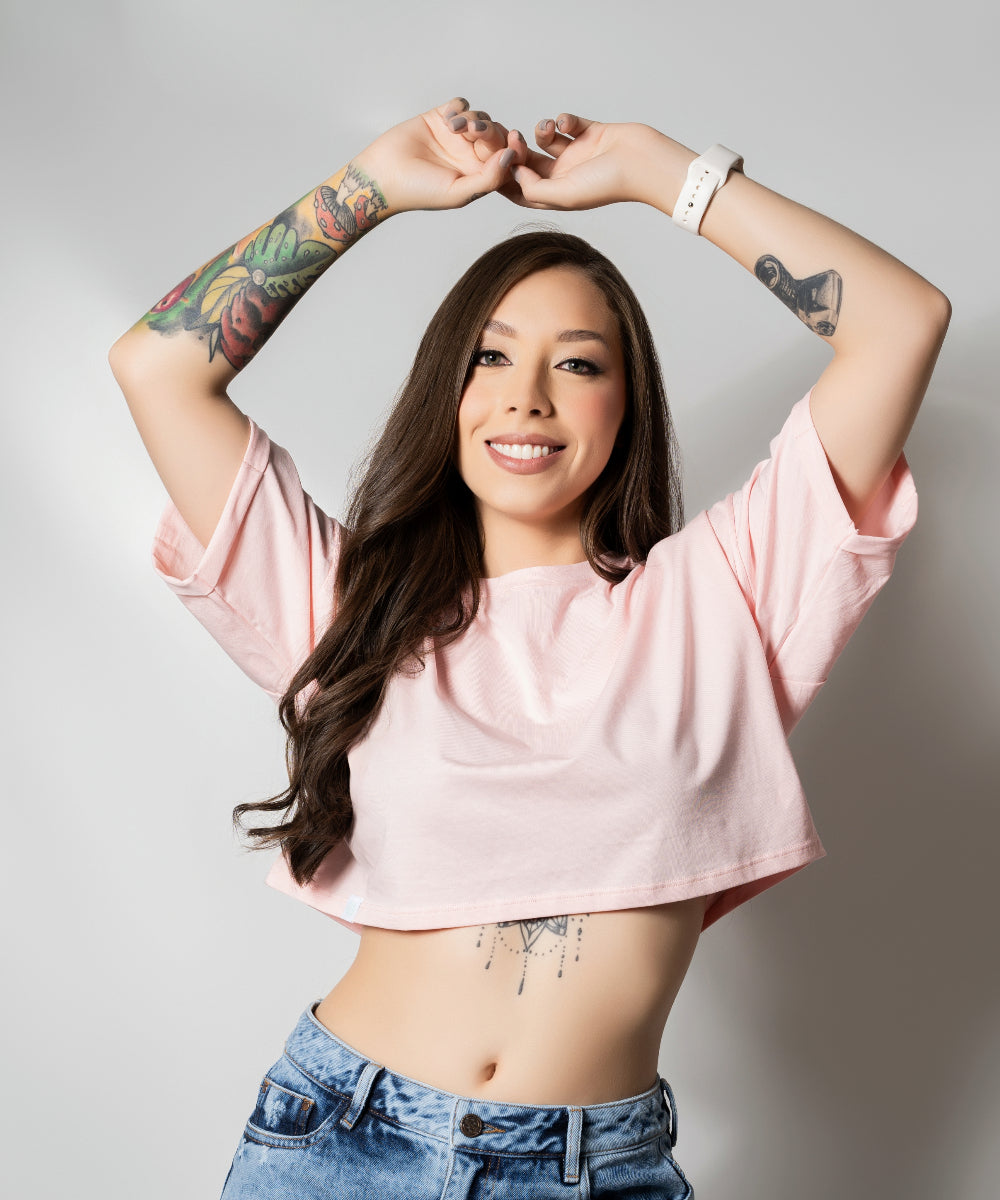 La modelo 1 mide 1.57 cms y esta usando una talla S