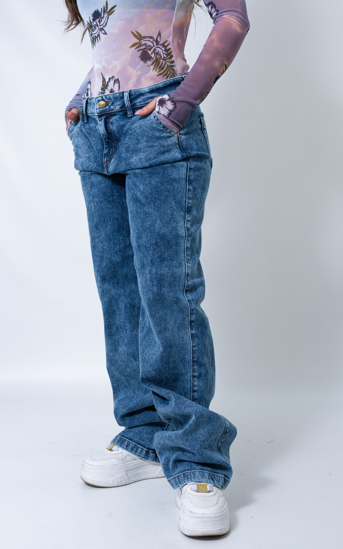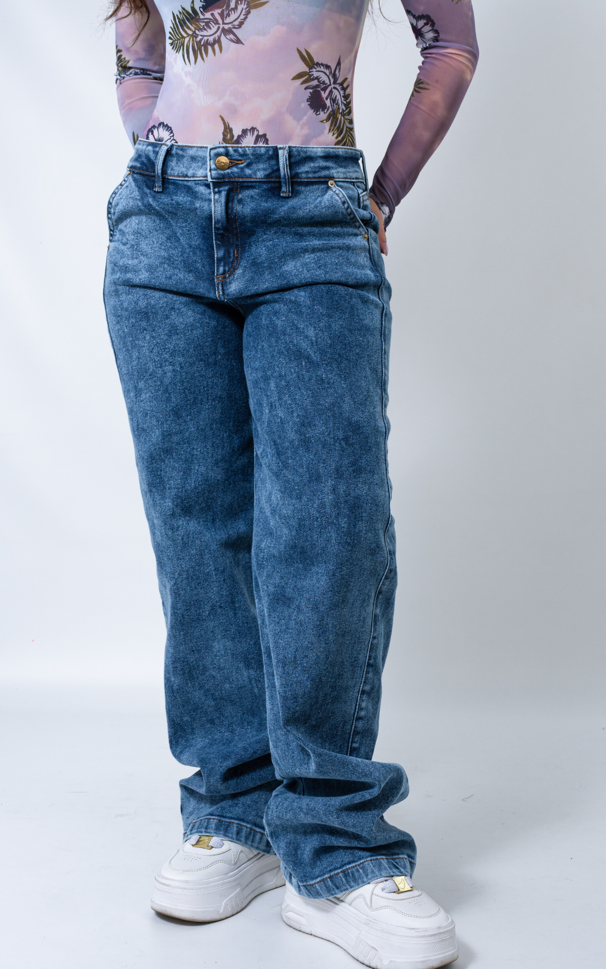 De bota recta y un proceso de lavandería saraviado en azul que lo hace único, cómodo y versátil para cualquier ocasión.