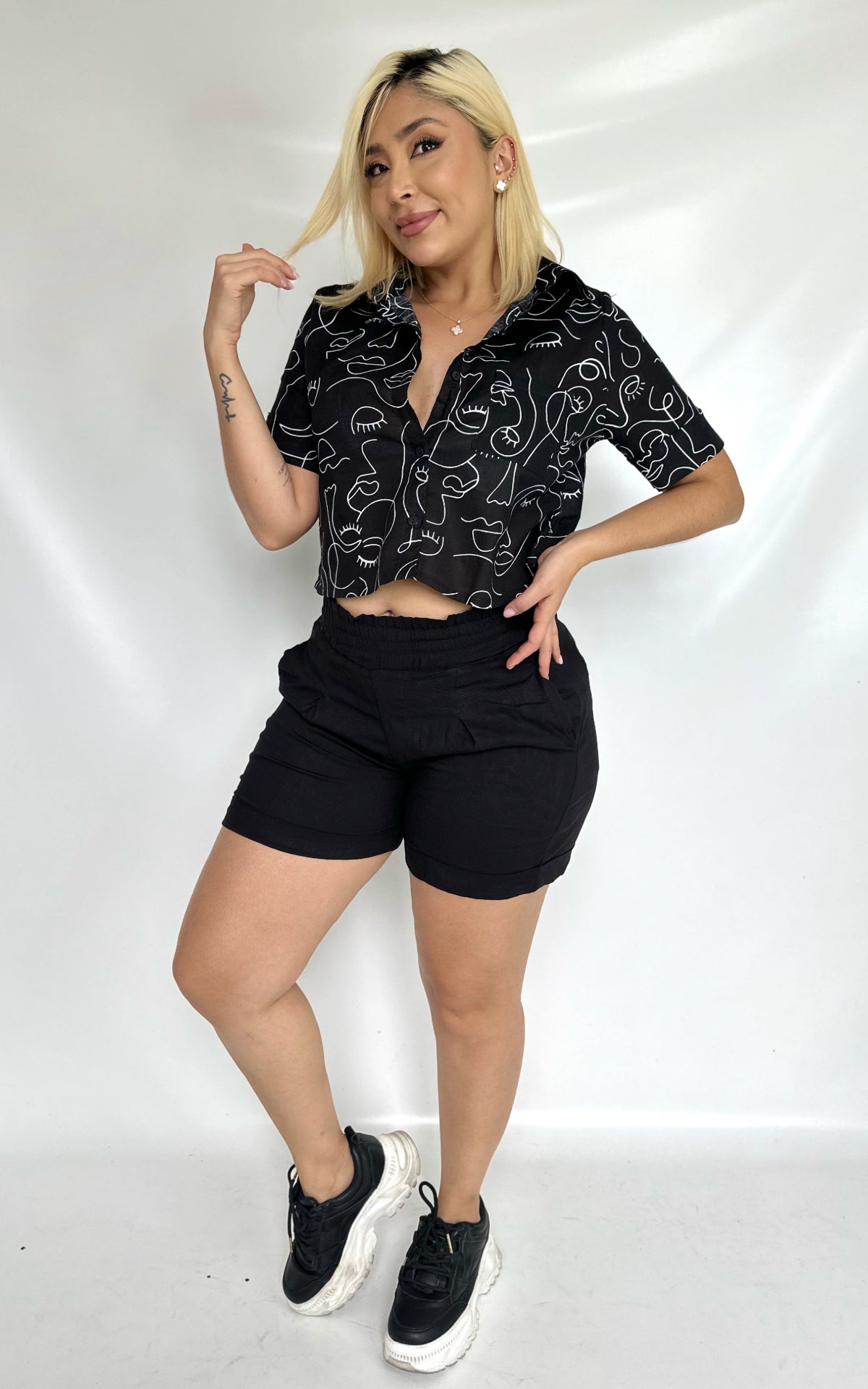 Fácil de Combinar: La blusa tipo camisa con botones es un básico elegante y versátil, ideal para usar junto con el short o combinada con otras piezas de tu armario.